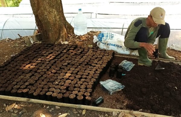 A nursery worker in Soreang  is filling polybags with planting media, carefully ensuring that each polybag is filled with an equal volume of the planting material.