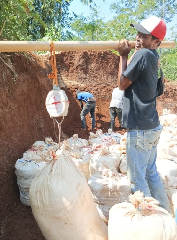 The workers at Ciminyak Nursery are weighing sacks of planting media. Once weighed, the media will be transferred to the seed beds area and filled into polybags.
