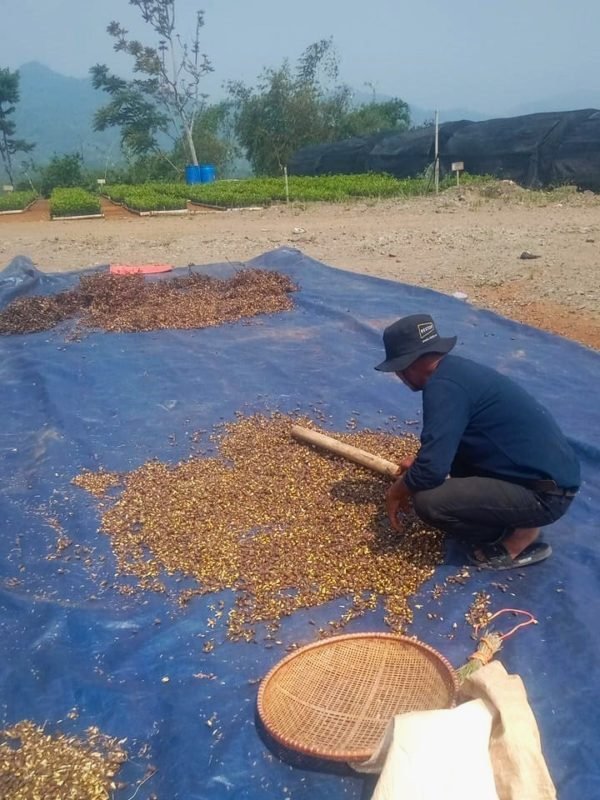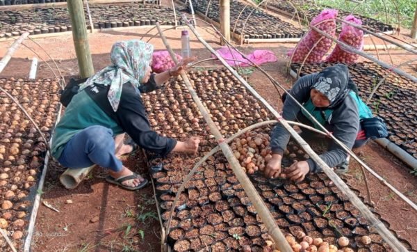 A nursery worker in Ciminyak nursery is cleaning and sun-drying Suren tree seedlings to eliminate excess moisture before proceeding with the sowing process.