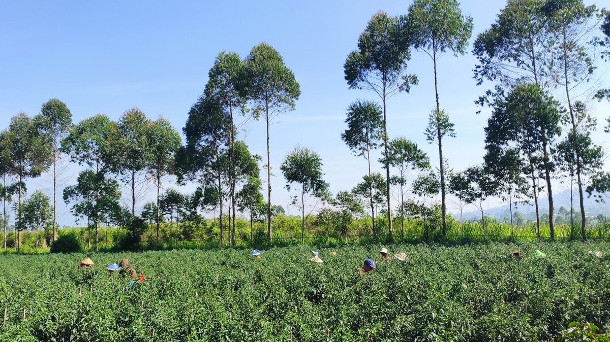 Harry is working with nature to maintain fertility on his farm. To avoid monocropping, his land is planted with a range of vegetables such as chili, potatoes, carrots, and tomatoes. Then, on the borders, he has planted eucalyptus and rasamala trees to provide shade. He has also planted groves of orange trees, which stand apart from his vegetable gardens.