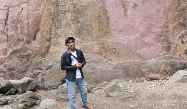 (Above) Suparmin, a local caretaker in Kebumen Geopark, stands in front of a massive basalt rock formation – an ancient sea floor.
