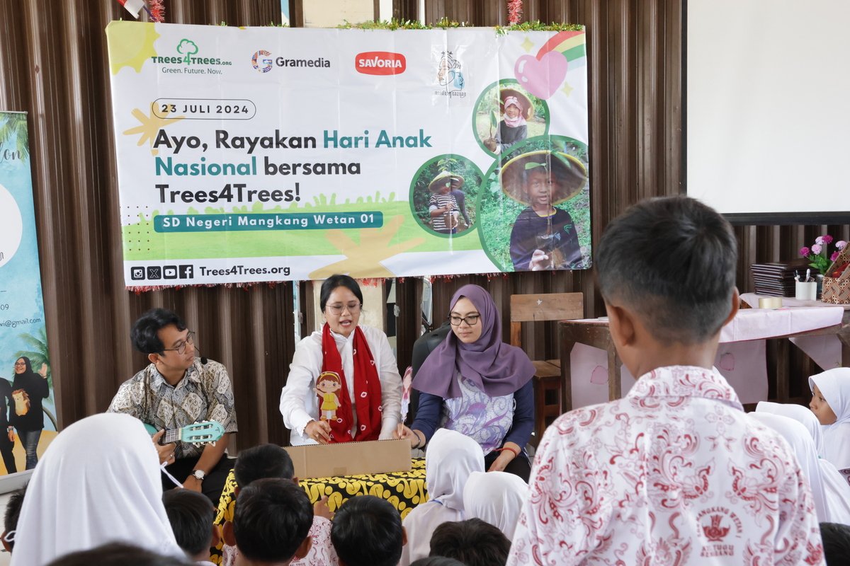 To provide children in both villages with essential knowledge on coastal protection and mangrove conservation, Trees4Trees organized an educational event through its Trees4School program. Coinciding with National Children’s Day on July 23rd, the event was held at Mangkang Wetan 01 Elementary School.